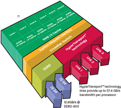 AMD’s more flexible alternative to the front-side bus is called HyperTransport, and it’s been in use since the Athlon XP. Whereas the front-side bus only connects CPUs to the northbridge, HyperTransport interlinks CPUs, core logic components, and memory. Taken together, AMD calls this web ofHyperTransport links Direct Connect Architecture (DCA), and it’s the foundation of Opteron’s rocket ride to success in the first half of this decade.